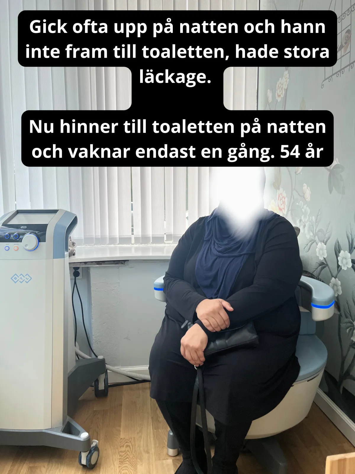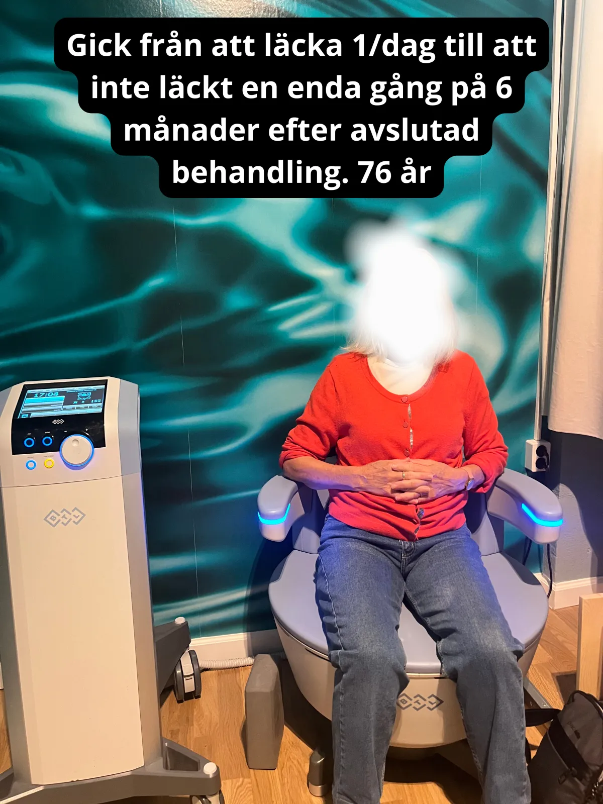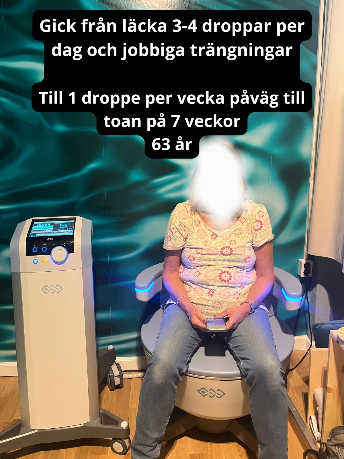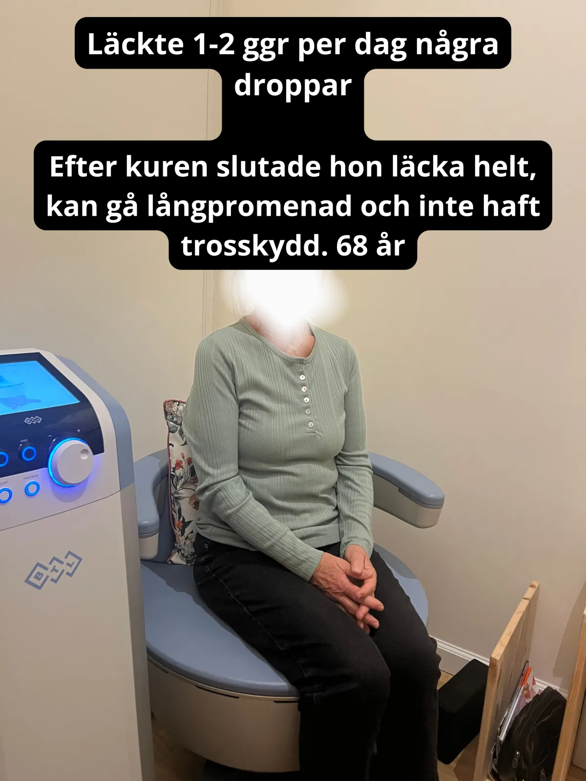 Efter 4-5 behandlingar så sov hon genom hela natten och efter 7 behandlingar hade hon inte läckt på hela veckan mellan behandlingarna. Kerstin känner att hon kan hålla sig hela vägen till toaletten, behöver inte säkerhetskissa längre och har helt slutat använda skydd.